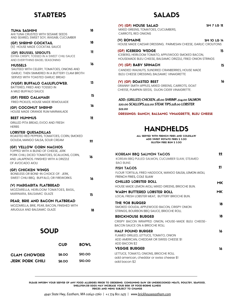 Welcome to Brickhouse Seafood and Grill, a culinary gem located at 4940 Mid-Cape Highway in Eastham, MA. Known for its vibrant atmosphere and exceptional service, this restaurant boasts a diverse menu that caters to every seafood lover's dreams. Start with a comforting Chowder or Chili, and move on to mouthwatering burgers like the renowned Brickhouse Burger or the unique Korean BBQ Salmon Taco.